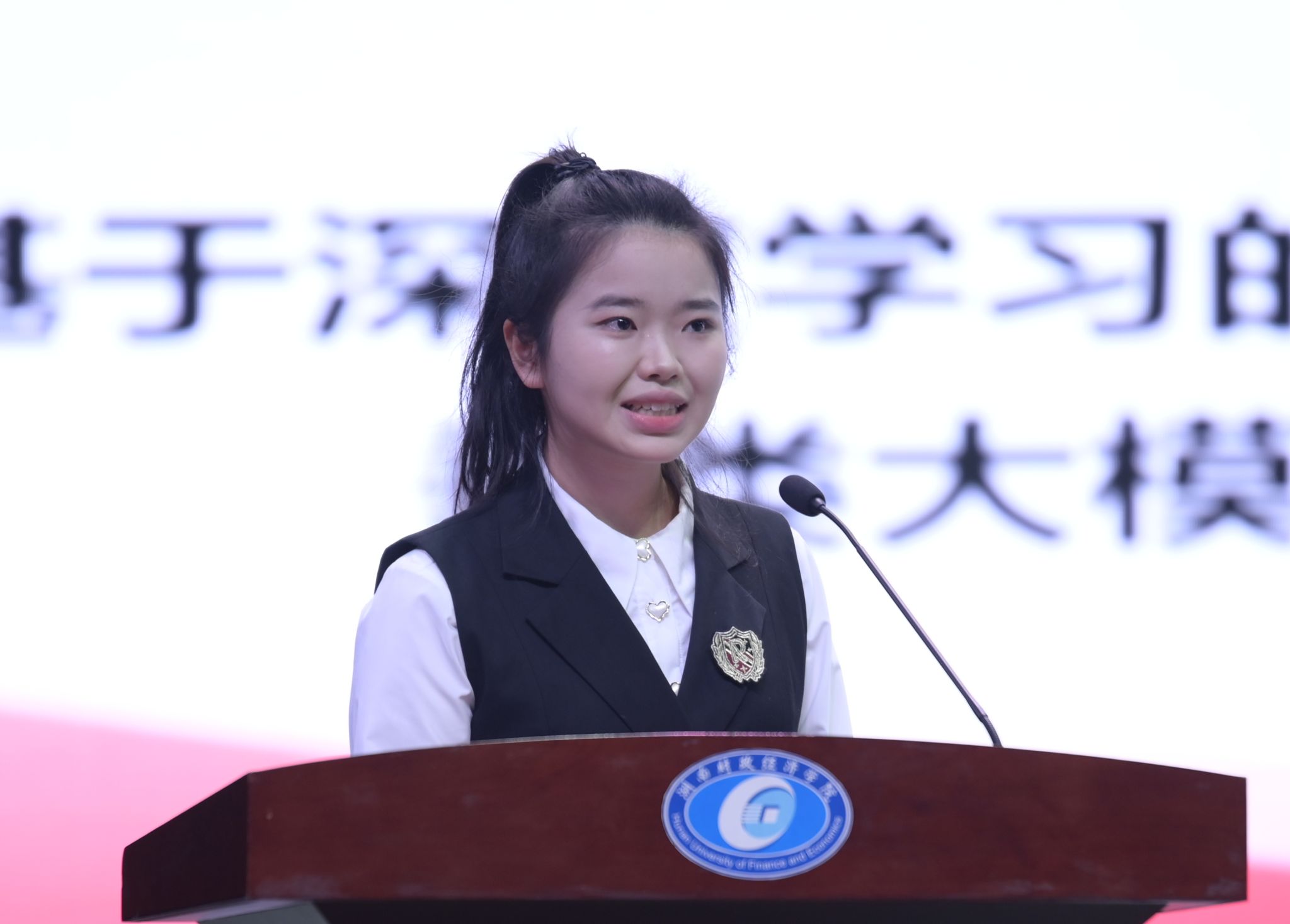 国家奖学金代表张睿宁、校级奖学金获奖代表刘宁华、先进集体获奖代表周景琪先后发言,分别结合科研创新、学科竞赛、社会实践等方面,分享了各自的奋斗历程与心得体会。