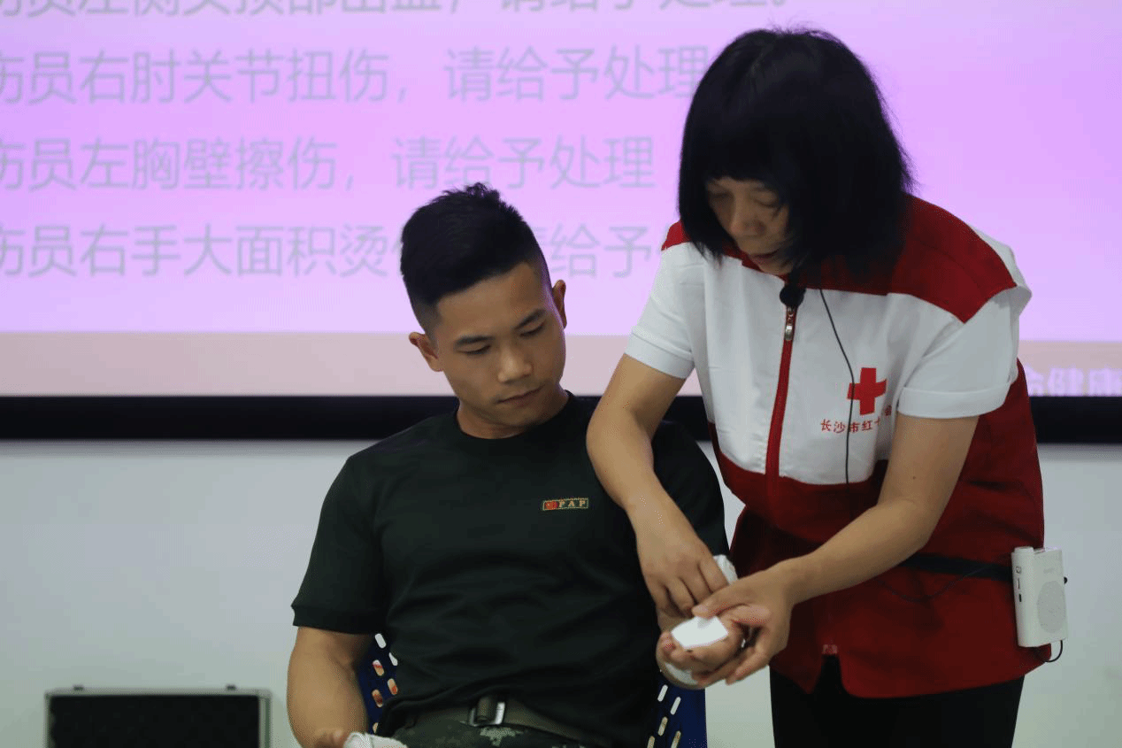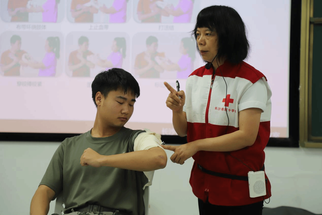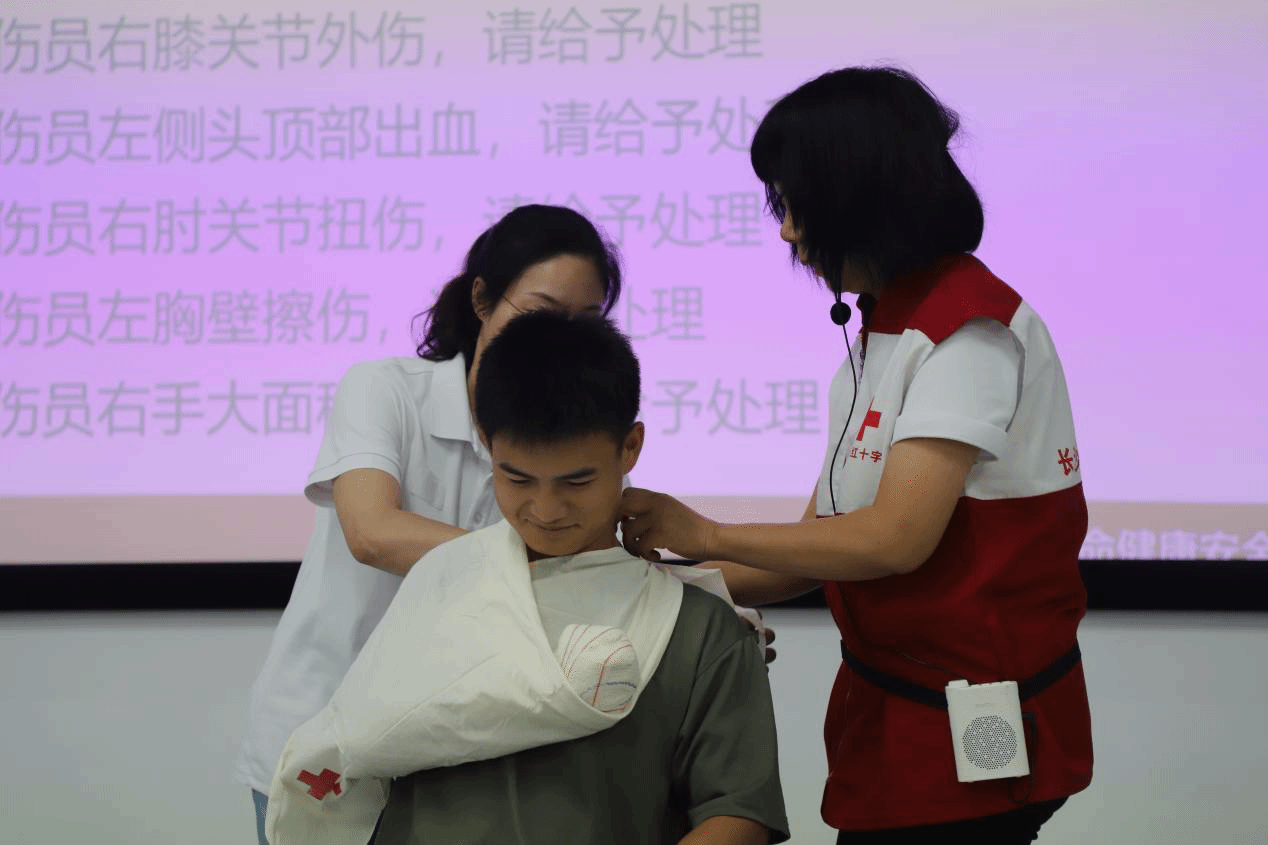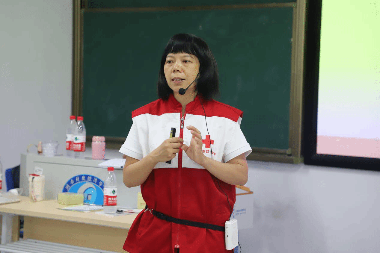 培训分为理论授课、实操及考核三大部分。理论授课环节,来自长沙市红十字会的讲师为学员们仔细讲解了心脏骤停、气道异物梗阻及突发损伤的具体表现,展示了心肺复苏的整套流程、AED仪器的使用步骤以及止血包扎的多种方法等,为大家普及了紧急救护常识。