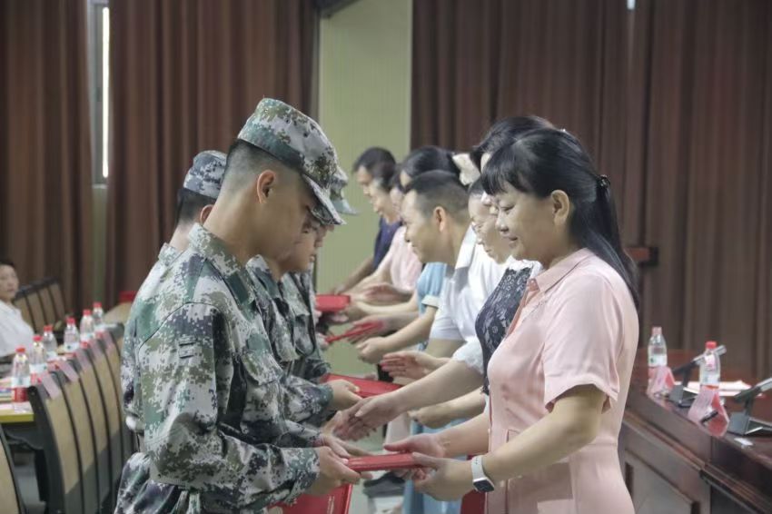 各二级学院学工负责人上台为全体新生军训教官颁发聘书。