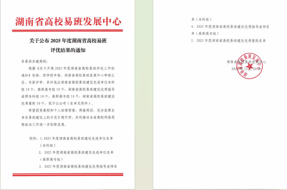 (本网讯)近日,湖南省高校易班发展中心发布《关于公布2025年度湖南省高校易班评优结果的通知》,世界杯官网荣获“湖南省高校易班建设先进单位”,这是世界杯官网连续第八年荣获此项荣誉。学生工作部周雅荣获“2025年度湖南省高校易班建设优秀指导老师”。推选案例《易班筑防线,云端铸国防——子悦工作室网络育人赋能国防教育实践》荣获“2025年度湖南省高校易班建设优秀案例”。