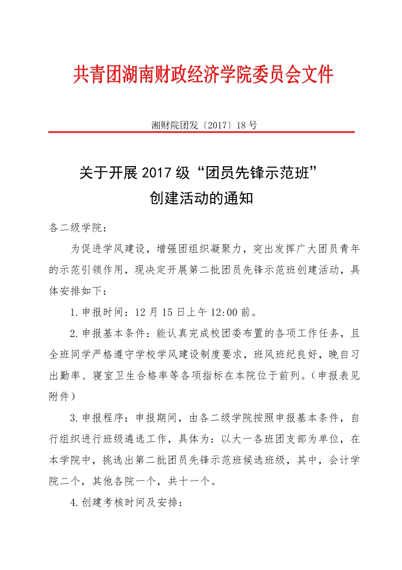 关于开展2017级“团员先锋示范班” 创建活动的通知