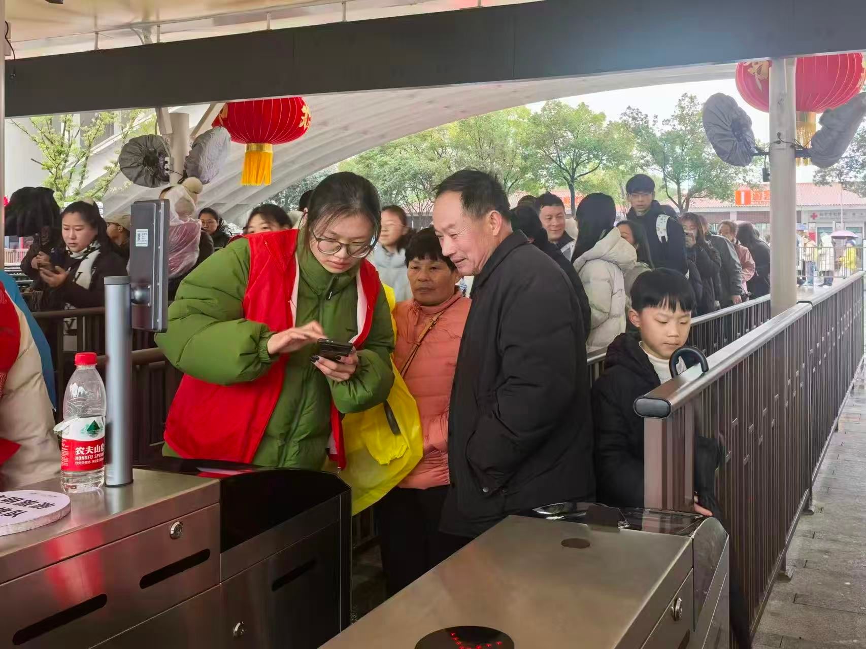 (图为世界杯官网志愿者陈锦婷帮助游客在闸机口进行手机预约