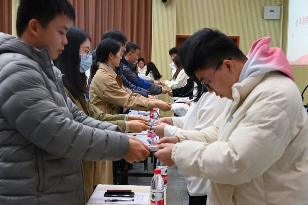 全体老师为新团员代表颁发团员证、团徽,这标志着他们正式加入中国共产主义青年团。新鲜血液的注入,为共青团增添了新生力量。团徽在胸前闪耀,团员的责任也将铭记于心,希望新团员们能肩负起实现中华民族伟大复兴的光荣使命,为共青团建设添砖加瓦。