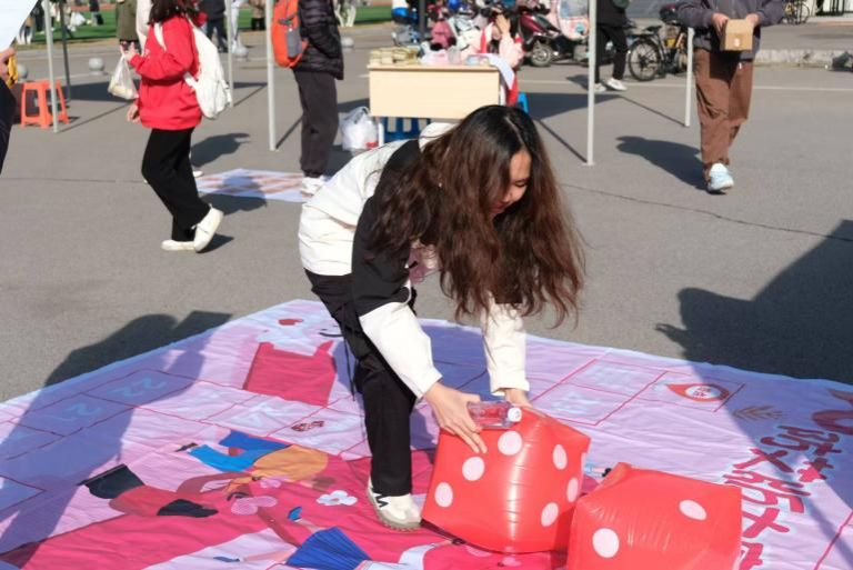 “艾”的跨越:同学们跳跃于纸板上,跨越艾滋传播危险地带,躲避着艾滋传播风险,寻找 一条正确的防艾路线。在游戏中,学习防艾知识,为自身安全筑起坚实的防线。