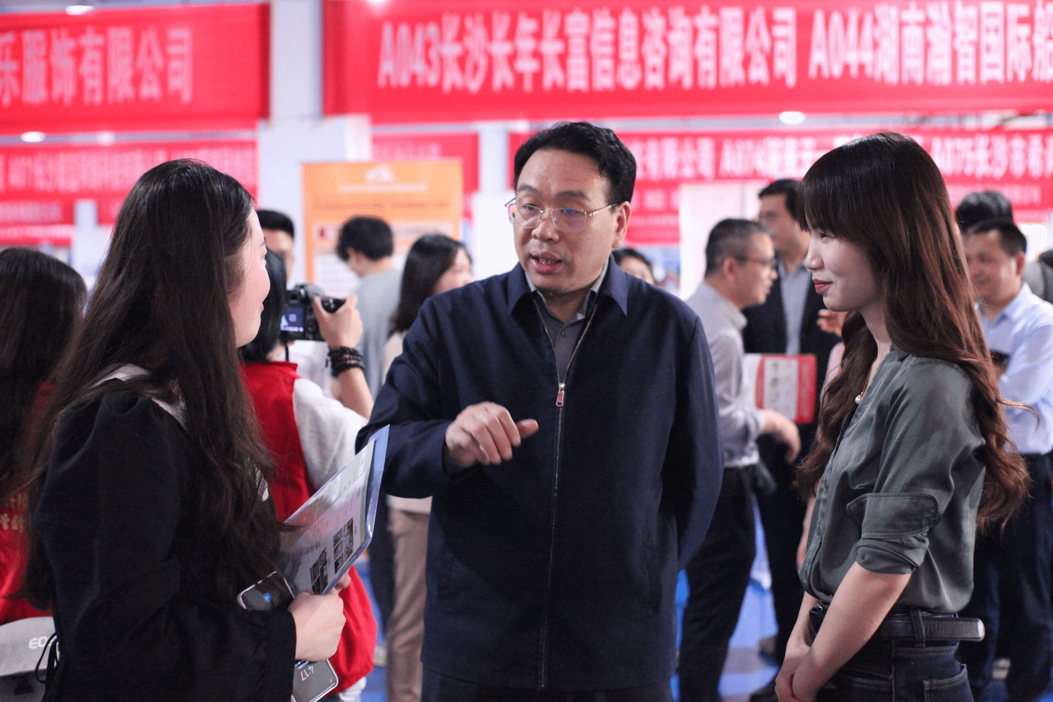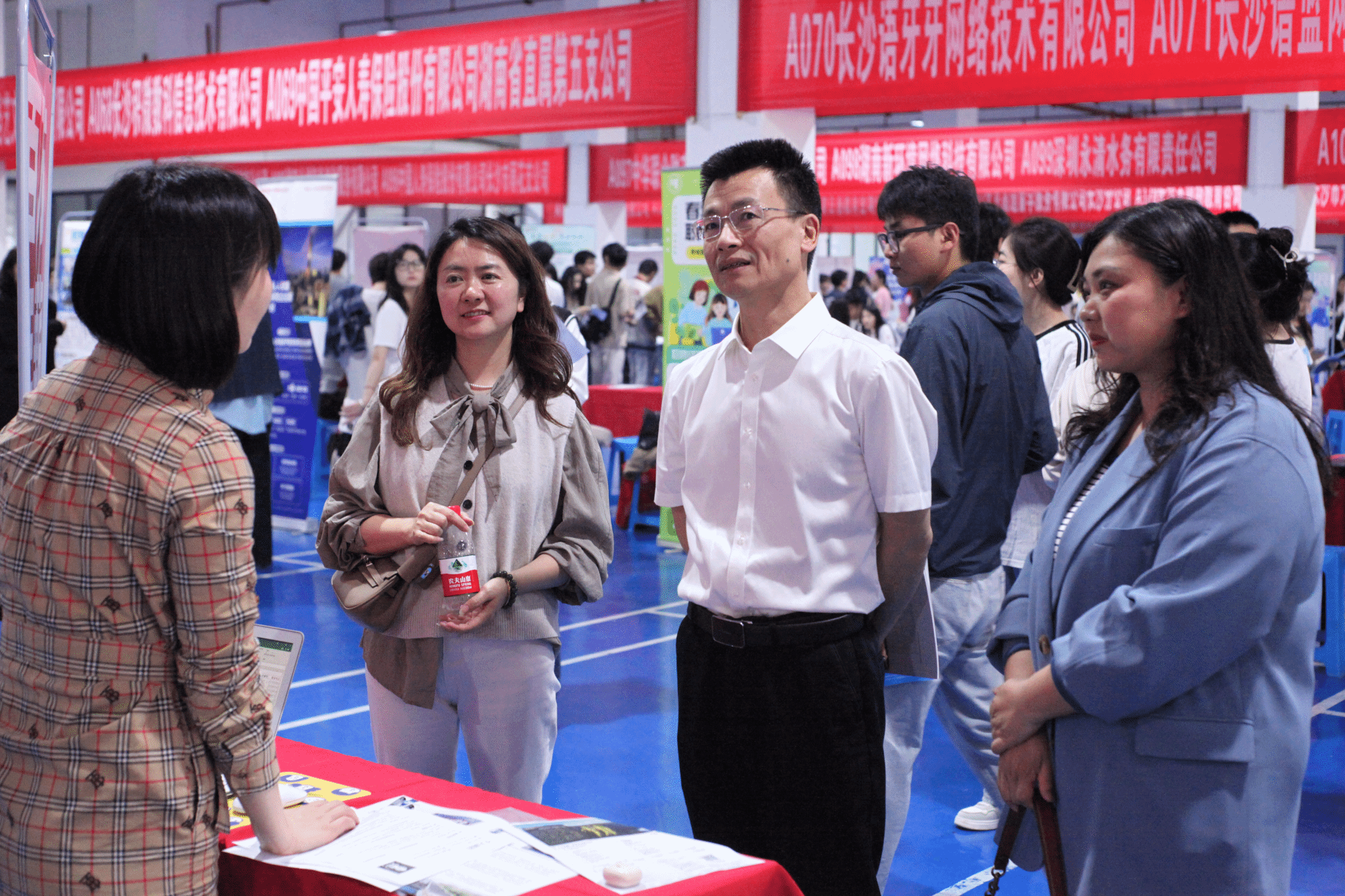 校党委书记易棉阳(左二)来到校友企业展位前与求职学生亲切交谈