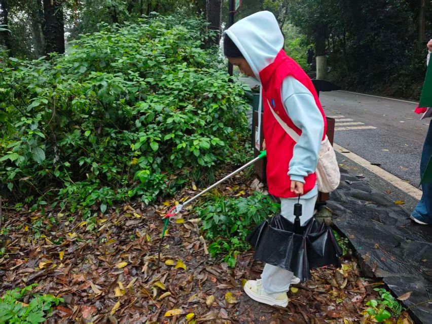 雨丝斜斜地织成一片薄纱,志愿者们沿着湿漉漉的山路缓缓前行,在朦胧的雨雾中,他们像一群沉默而执着的护林使者。志愿者们手里握着清洁夹,目光细细地掠过草丛、石缝、盘错的树根,连一片被雨水泡软了的纸巾、一个半埋在落叶里的塑料碎片,都不愿放过。有人踮起脚,伸手去够陡坡上那只飘摇的塑料袋;有人蹲下身,耐心地从石阶缝里夹出小小的烟头。山路湿滑,每走一步都得格外留神,大家却只顾着专注搜寻,脚步沉稳而坚定。看着垃圾袋一点点鼓起来,大家心里都泛起一种踏实而明亮的成就感。