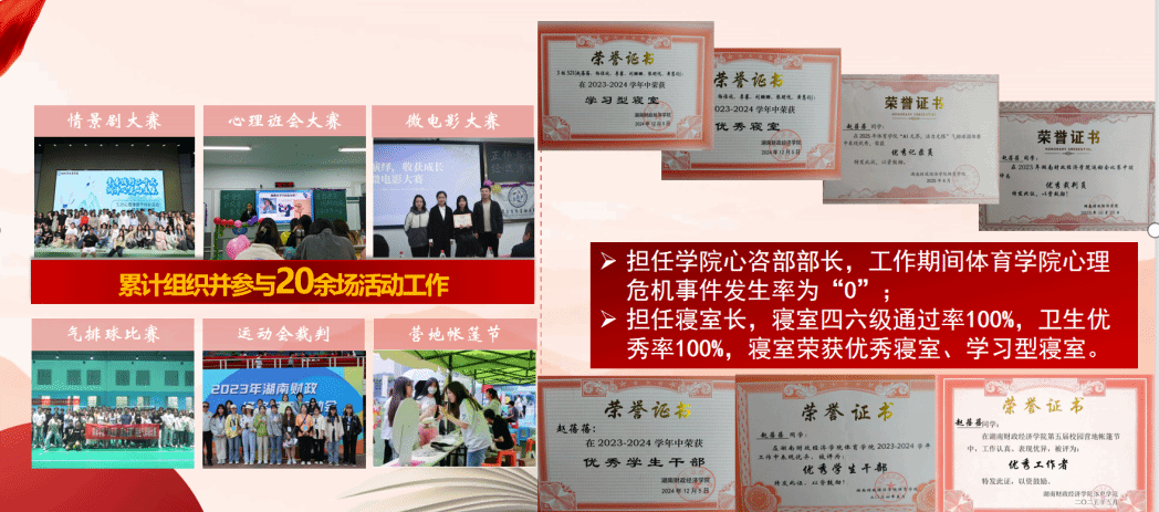 赵蓓蓓任职期间履职尽责,成功组织各类校园活动20余场,助力学院实现心理危机零发生;带领寝室获评“优秀寝室”,个人凭借突出的工作表现屡获“优秀学生干部”等荣誉。在“向新力”体育志愿服务队支教活动中担任调研组组长,入围“七彩假期”实践团队,带领孩子们体验新型体育课程、学习运动技能;返家乡实践中协助村政府推广“湘易办”APP,相关事迹获人民网等多家媒体报道。