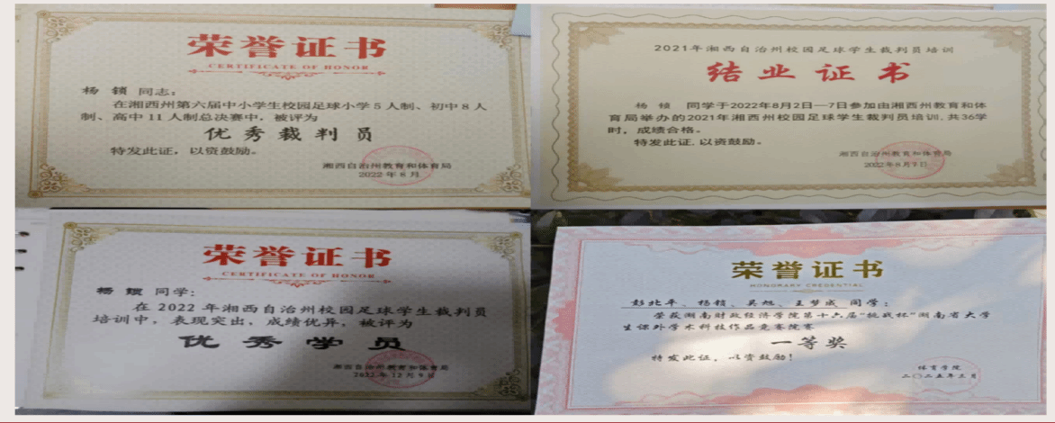 积极投身校内外实践活动,在2021年湘西自治州校园足球学生裁判员培训中获评“优秀学员”,在湘西自治州校园足球总决赛中被评为“优秀裁判员”;参与2026世界杯官网第十届学生课外学术科技作品竞赛,荣获院级一等奖。凭借在校园营地帐篷节中的突出表现获评“先进个人”,在实践中不断提升综合素养,用实干诠释责任担当。