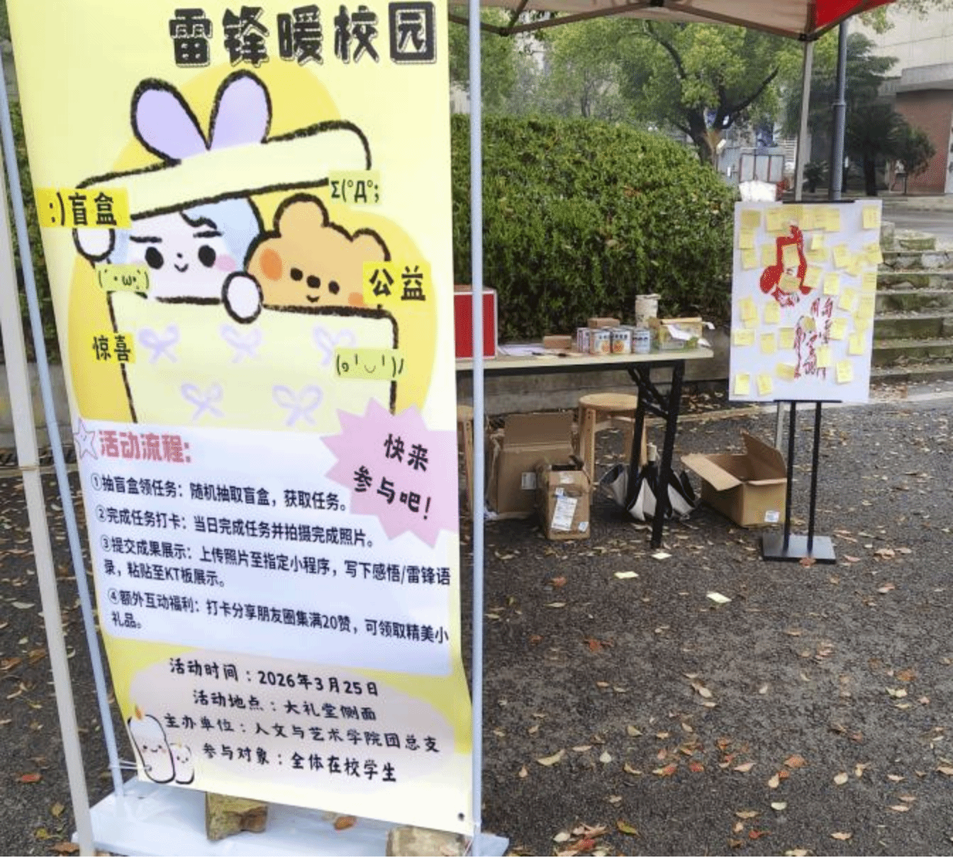 为弘扬雷锋精神、培育校园文明风尚,3 月 25 日,世界杯官网人文与艺术学院在主校区成功举办 “盲盒启善意,雷锋暖校园” 爱心摆台活动。活动由学院团学会统筹策划,各部门协同配合,以创新形式吸引众多同学参与,取得良好育人成效。