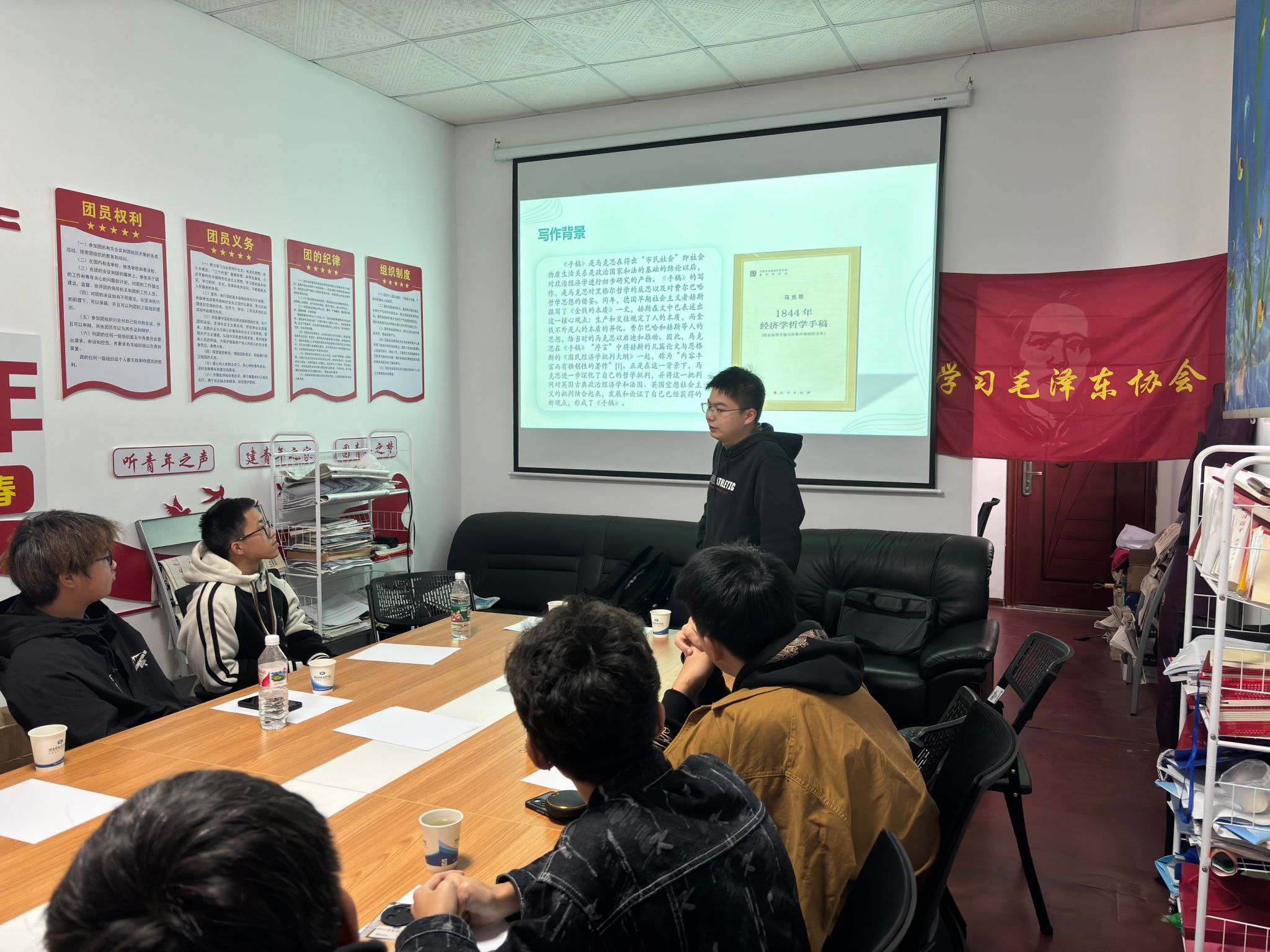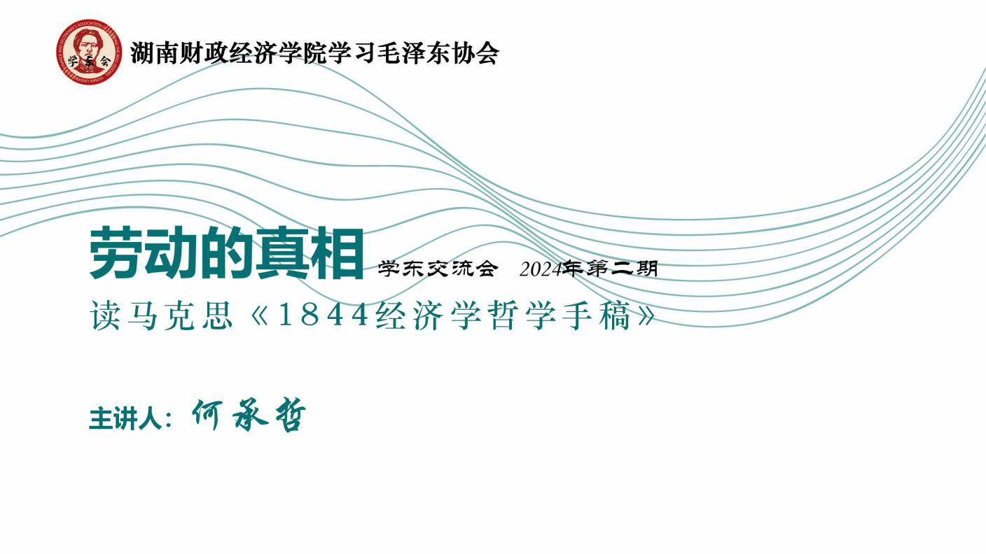 2024年3月17日下午14时,世界杯官网学习毛泽东协会在大礼堂三楼会议室如期举行了2024年第二期学东交流会。本次交流会的主题是《劳动的真相——读马克思<1844经济学哲学手稿>》,由学东会会长何承哲同学担任主讲人。此外,来自湖南第一师范学院的罗奕欣、殷天怡两位同学作为外校嘉宾出席了此次活动。
