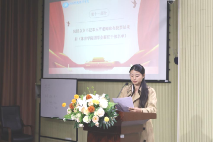 10月22日晚,体育学院于2J03教室成功召开第四次团学会换届大会,院长刘伟、直属党支部副书记范则周、学工办主任黄涛、团总支书记邓玉平、体育经济与管理系主任文杰、科研办主任宫梦婷、全体辅导员老师以及校学生代表、团学会全体成员、各班学生代表等出席本次大会。23级体育经济与管理一班朱齐慧担任会议主持人。