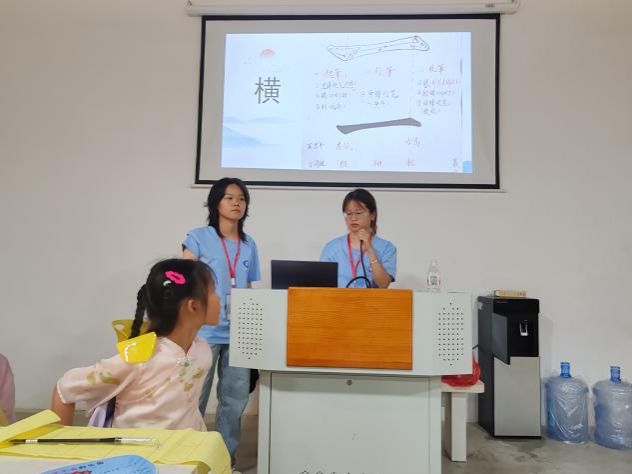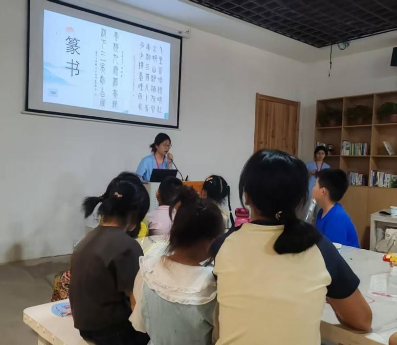活动伊始,志愿者小蒋老师结合PPT,带领孩子们认识古代五大书体,领略篆书的古朴、隶书的典雅、楷书的规整、行书的灵动以及草书的奔放。从握笔姿势到笔画“横”的起笔、行笔、收笔,生动的讲解让孩子们聚精会神,小手指着屏幕叽叽喳喳地讨论,原本对书法知之甚少的孩童,瞬间被古老的文字魅力牢牢吸引。
