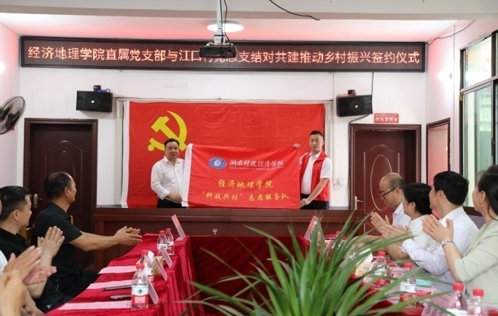 会上成立了经济地理学院直属党支部“科技兴村”志愿服务队,文炳勋为志愿服务队授旗。志愿队队长张鹏博在接过队旗后郑重承诺:志愿服务队将在上级党组织的领导下,深入田间地头,投入乡村振兴主战场,虚心向村里的“土状元”“田博士”“致富能手”学习,发挥聪明才智,为建设美丽富饶江口村贡献力量。