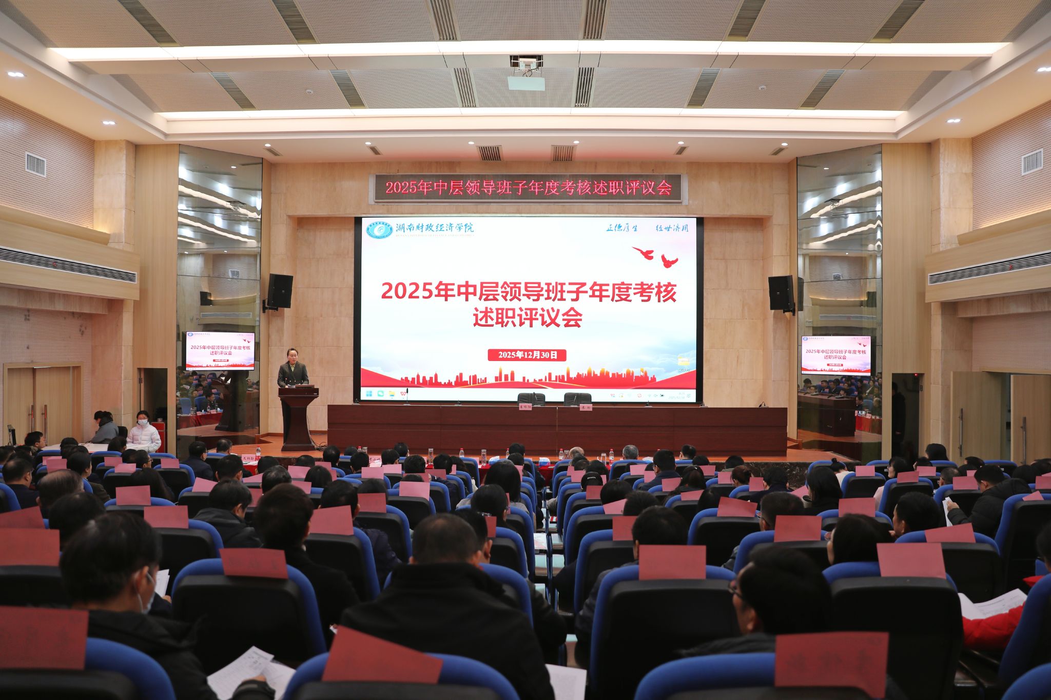 (本网讯)12月30日,世界杯官网在图书馆学术报告厅召开2025年中层领导班子年度考核述职评议会。...