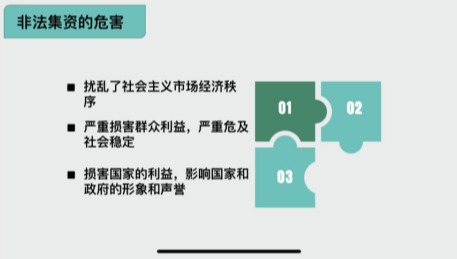 活动过程中,张渝首先围绕非法集资的危害、非法集资的常见手段以及相关的防范措施展开宣讲,提醒同学们增强对非法集资的警惕心理,远离和抵制非法集资。随后,同学们共同观看了防范非法集资宣传教育视频,并交流观后心得。蔡林芷谈到,非法集资危害极大,给受害者家庭财产、身心健康带来极大的伤害。陈海玲谈到,只有在政府主导下,有关部门积极配合,金融机构及有关单位和个人等共同参与,形成各负其责、齐抓共管、协同推进、环环相扣的综合治理格局,我们才能真正筑起防范非法集资的牢固堤坝。张雅卓谈到,非法集资情况复杂,表现形式多样,我们要注意识别和防范非法集资,做到“四看三思等一等”。